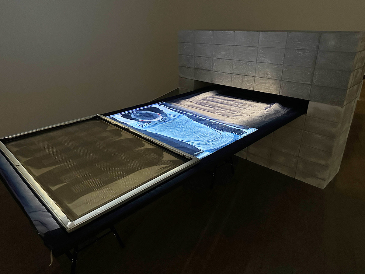 布がつくられていくさまを、布の上に投影した映像でみせていく、マルチメディア・インスタレーション。とても印象的な展示手法です。