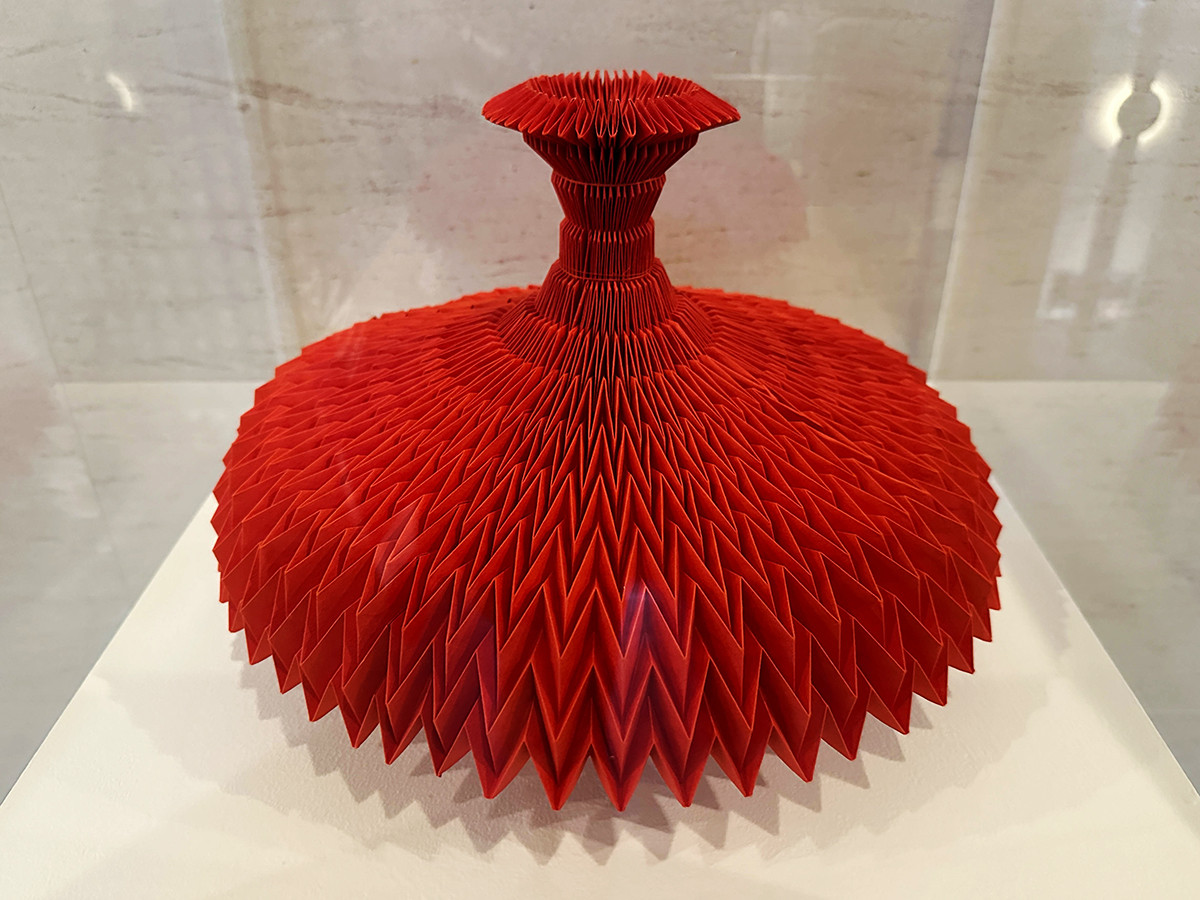 折り紙は、一枚の平面に山と谷をつけて立体をつくる日本の遊びです。折り紙の形状を布地に写し取るため、NUNOは学生服のプリーツスカートをヒントにしながら、試行錯誤の末に技法を開発。さらに、温度で変化する糸を用いて、布を山と谷に折り上げる織物も進めています。