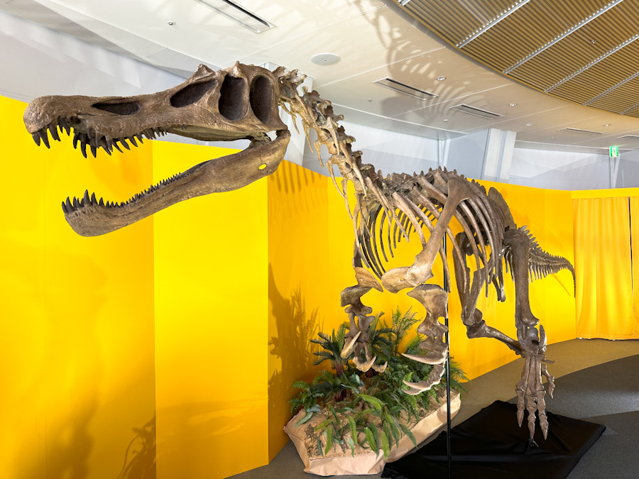 展覧会最大の目玉といえるのが、全長約15メートルとライフサイズのスピノサウルスのロボット。動くのは頭部だけですが、それでも迫力たっぷり。展示されているフジテレビ球体展望室との相性もバッチリです。