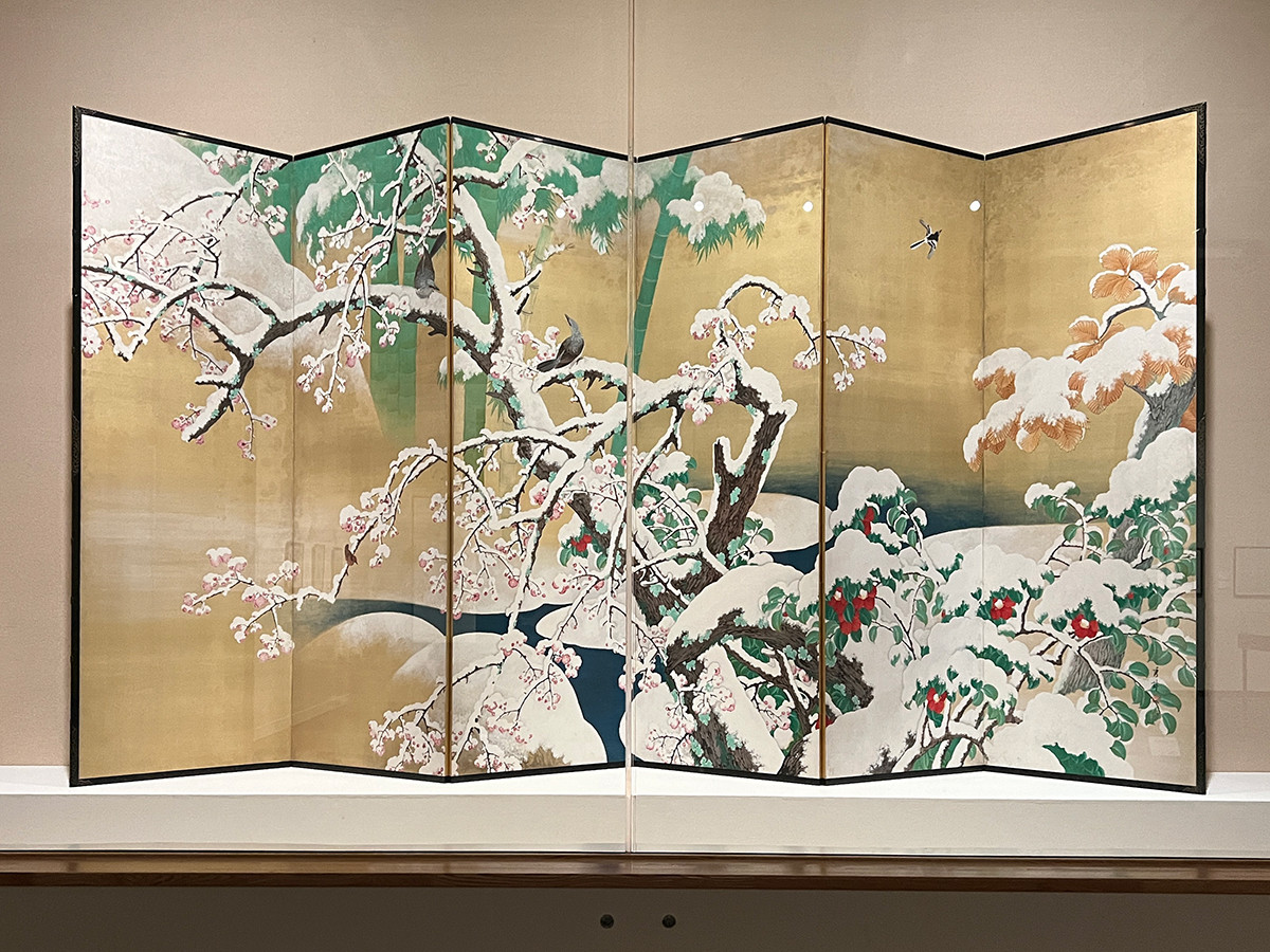 文展には第2回展から出品し、第10回展からは3年連続で文展特選を受賞。第12回展の《四季花鳥》では、秀畝が得意とした花鳥を鮮やかな色彩と緻密な描写で描きながら、狩野永徳や山楽といった桃山美術を研究した新たな表現に挑んでいます。