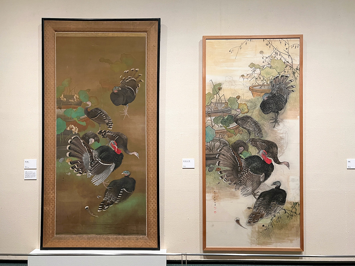展示室内で一際目を引くのは、展覧会ポスターにも使用されている、荒木寛畝と秀畝が手がけた杉戸絵。旧大名家、蜂須賀候爵邸内に飾られたもので、旧派の作品が皇室や華族からも好まれていたことが分かります。