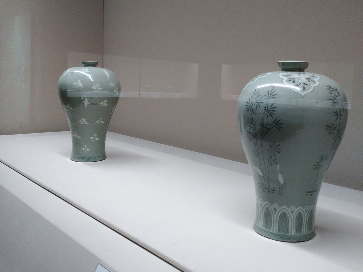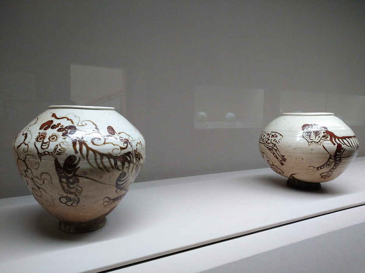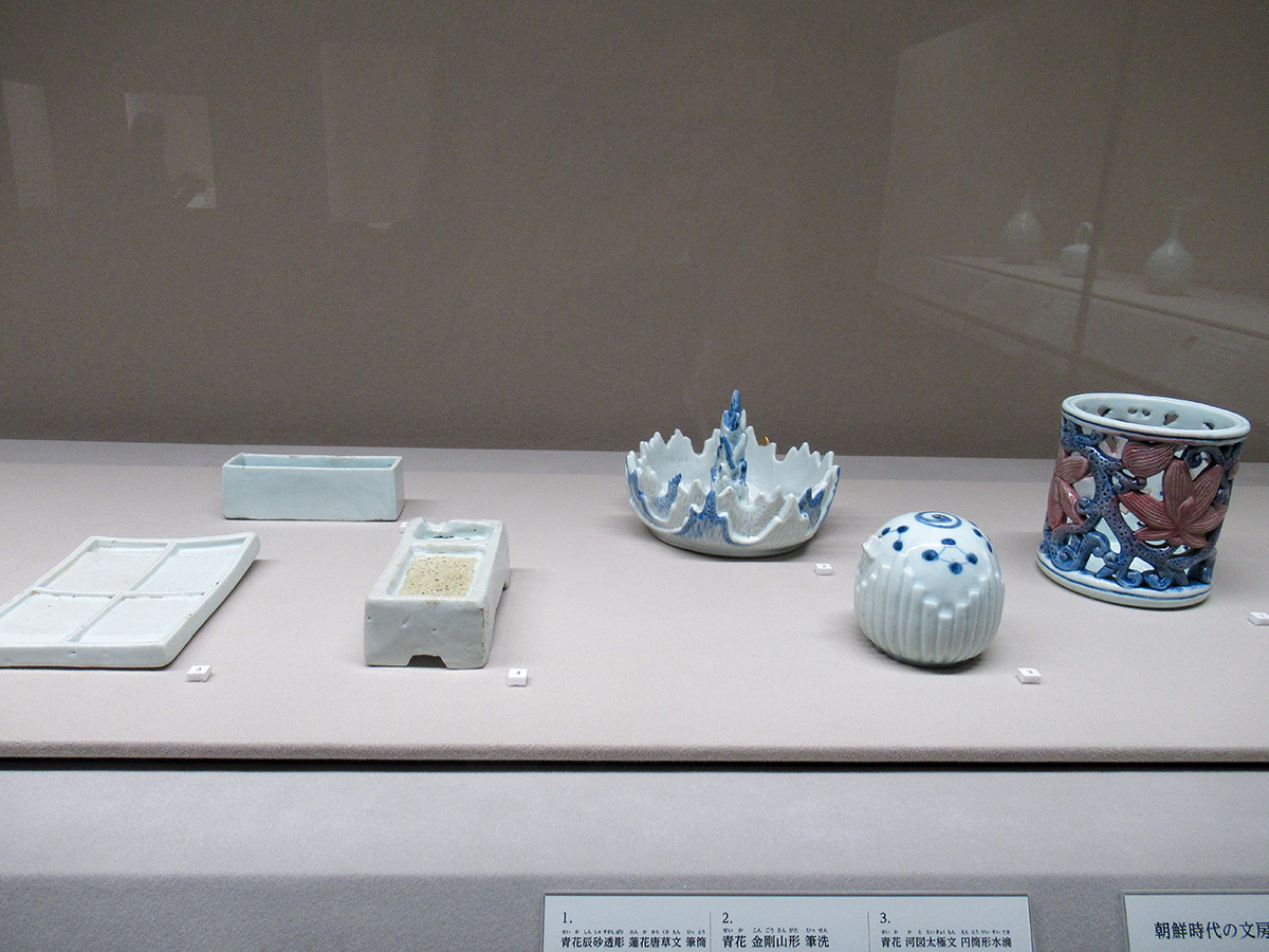 李秉昌博士からの寄贈コレクションは美を堪能できる空間です。ちょっと面白いなと感じたものは筆筒や筆洗など文房具類の展示です。朝鮮時代のもののようですが、文字や絵を描く小さな道具にも透かし彫りや絵付けが美しく、大切にされてきたことが伺えます。この隣には化粧道具類も並び、どんな風に使ったのだろうと思いながら拝見しました。
