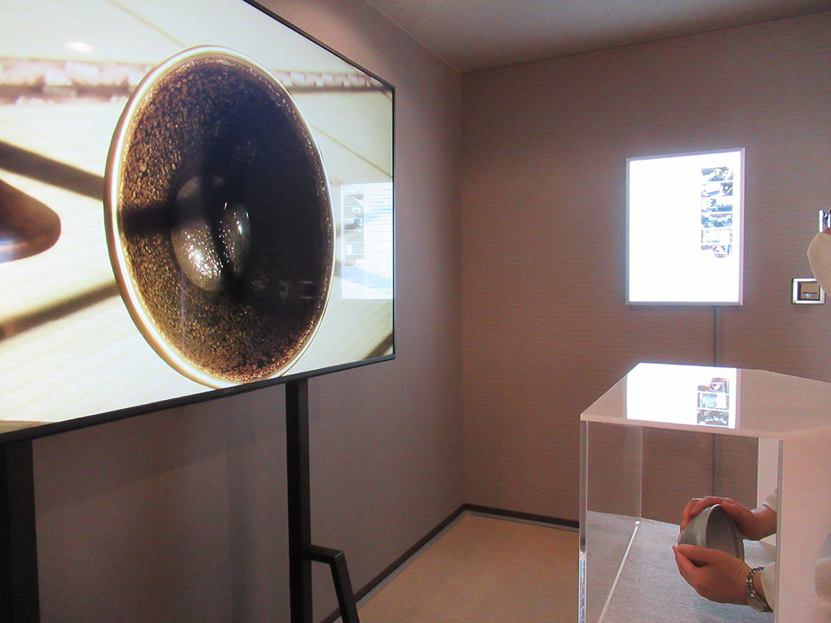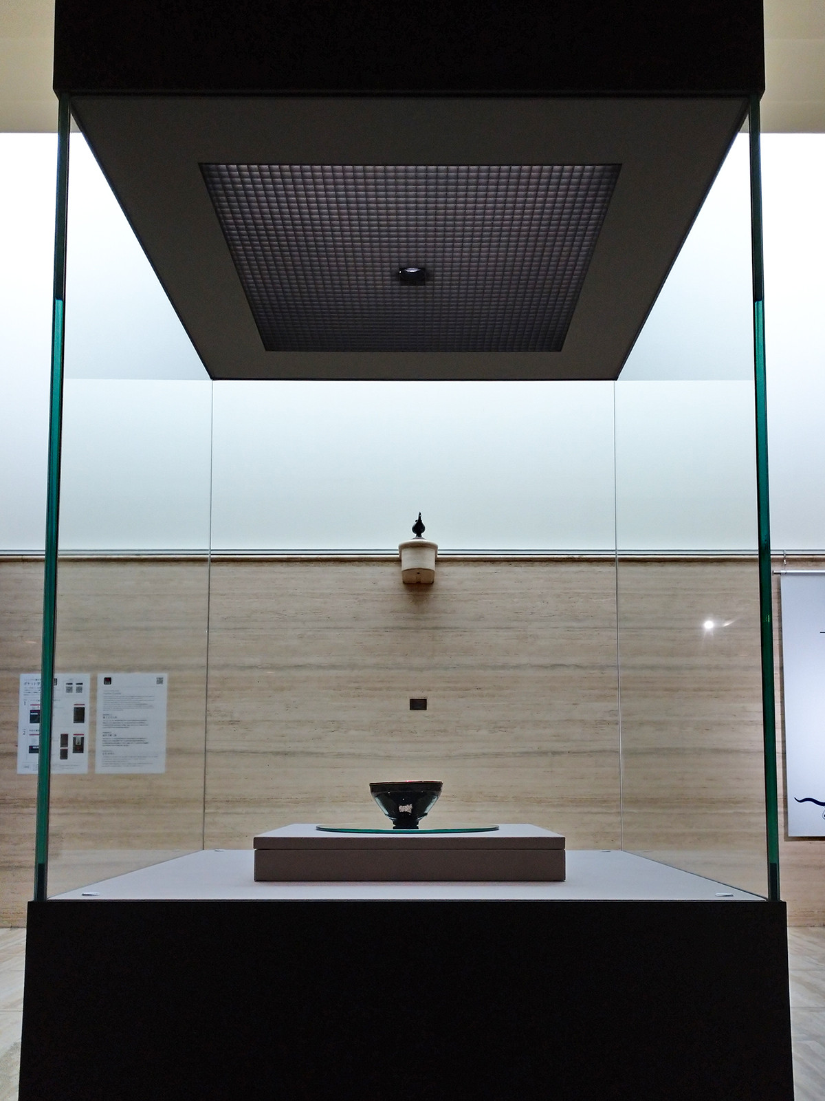 そしてこちらが国宝、油滴天目茶碗です。スポット照明や高透過ガラスを用いた専用の展示ケースが設置され、360度ぐるりと鑑賞できます。また、映像ルームではこの国宝を手に取ったように体感できるデジタルプログラムが大きな魅力として加わりました。茶碗の厚みや重さを感じながら好きな角度にして見ることができます。