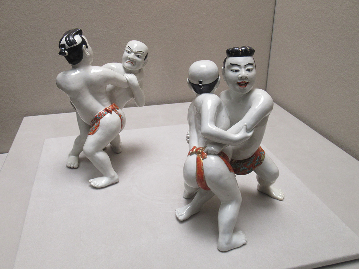 もちろん日本の陶磁コレクションも充実しています。奈良時代の三彩の壺から瀬戸、美濃、唐津そして有田や古清水など日本国中の窯から逸品が大集合しています。各地の特色を生かし、こだわりを持って文化を継承してきた窯と土との格闘が創り出した陶芸は、海を渡って絶賛されました。この有田窯の柿右衛門様式の相撲人形は、乳白色の肌や表情が生き生きと見え、優美な装飾も残っています。