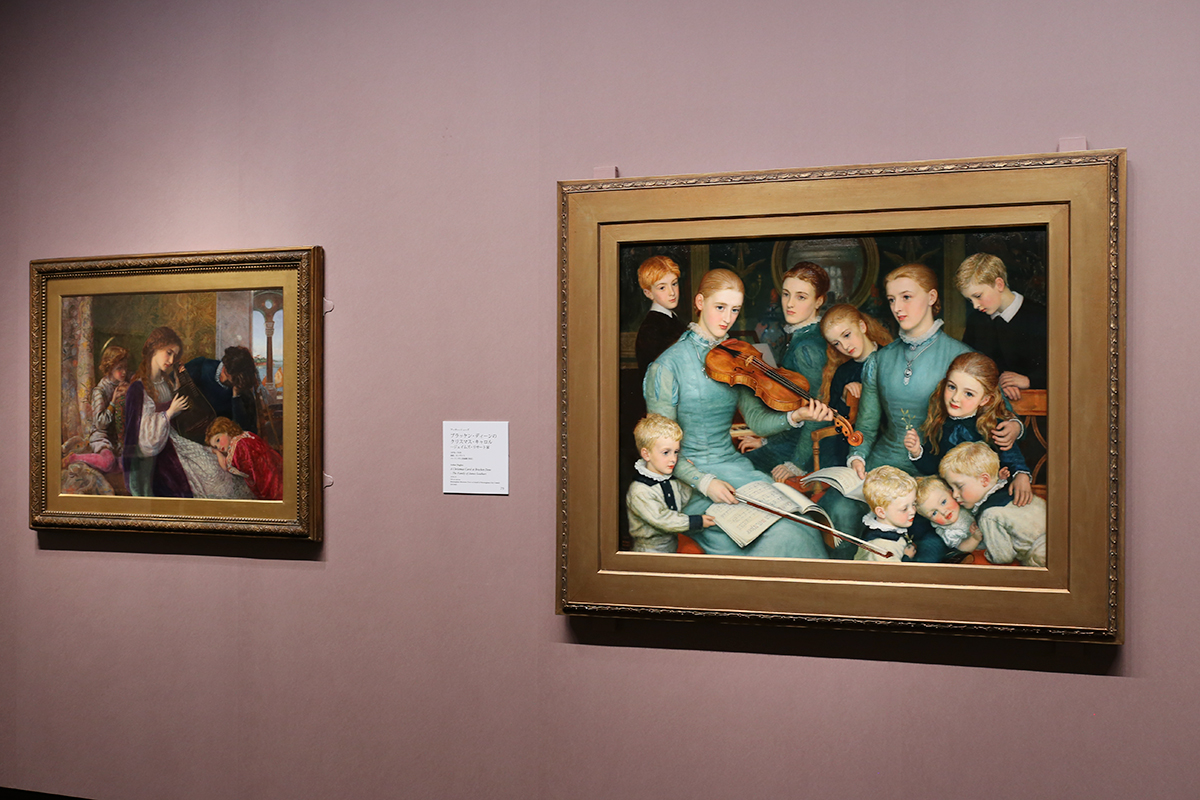 (左から)アーサー・ヒューズ《音楽会》1861-64年 リヴァプール国立美術館、レディ・リーヴァー・アート・ギャラリー / アーサー・ヒューズ《ブラッケン・ディーンのクリスマス・キャロル ─ ジェイムズ・リサート家》1878-79年 バーミンガム美術館