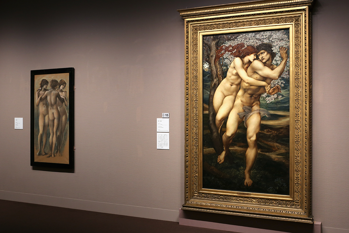 (左から)エドワード・バーン=ジョーンズ《三美神》1885-96年頃 タリー・ハウス美術館 / エドワード・バーン=ジョーンズ《赦しの樹》1881-82年 リヴァプール国立美術館、レディ・リーヴァー・アート・ギャラリー
