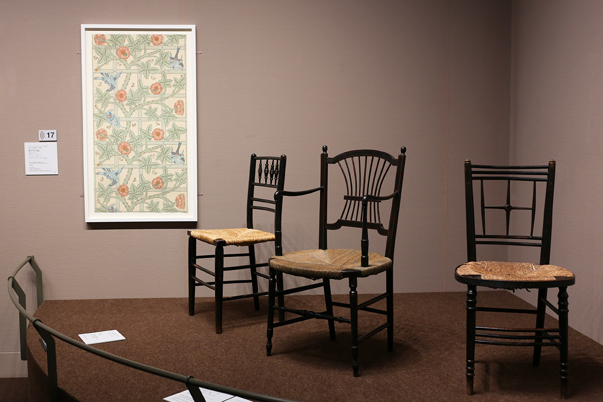 (左から)モリス・マーシャル・フォークナー商会(1875年以降はモリス商会)《格子垣(壁紙)》1862年(デザイン) デザイン:ウィリアム・モリス ウィリアム・モリスギャラリー / (椅子3点)モリス・マーシャル・フォークナー商会(1875年以降はモリス商会)《サセックス・チェア》(左から)1865年、1863年頃、1865年頃 大阪中之島美術館