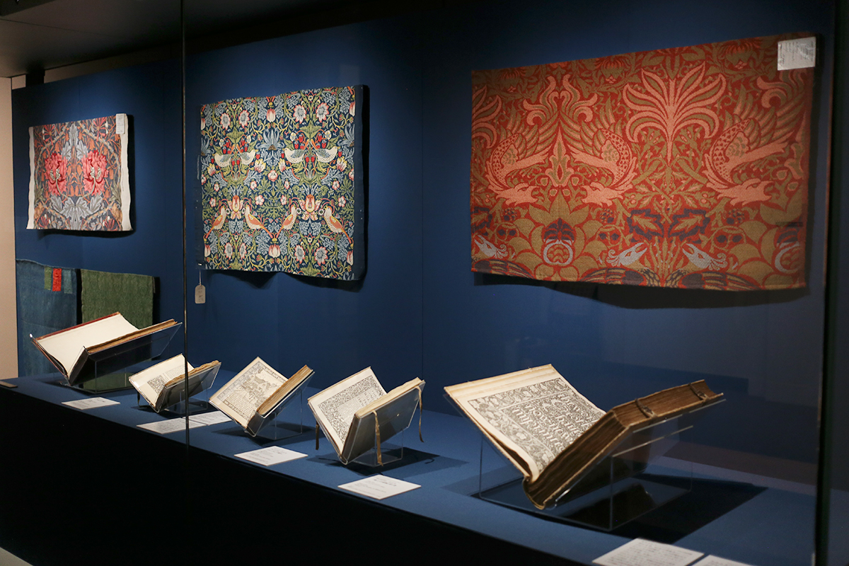 第5章「ウィリアム・モリスと装飾芸術」 (壁3点)モリス・マーシャル・フォークナー商会(1875年以降はモリス商会)《ウィリアム・モリスとモリス商会による装飾用織物》(左奥から)スイカズラ、イチゴ泥棒、孔雀と竜