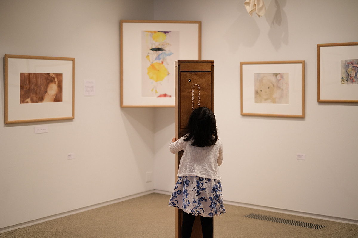 今回の展覧会では、展示室ごとに《絵を見るための遊具》が点在しているのも見どころの一つです。上下に2つ覗き穴があるボックスには「おとなのしてん」「こどものしてん」と書かれています。子どもたちは不思議そうな顔で中を覗き込んでいました。おとなとこどもがどのように違うかは、見てのお楽しみです。そのほかにも、絵の一部が拡大されて見える遊具もありました。