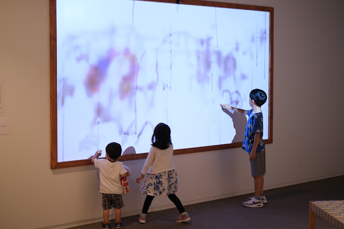 続いての見どころは、plaplaxが絵本『あめのひのおるすばん』(至光社)に着想を得て制作したという作品《まどのらくがき》です。作品の前に立つと雨音が響き、窓枠をイメージしたスクリーンには、曇った窓ガラス越しの場面が映し出されていました。幼い頃、雨の日の窓に指で絵を描いた経験は誰もがあるのではないでしょうか。スクリーンの上で指を動かすときゅきゅっという音がして、あの感覚を体験することができます。もちろん子どもたちは夢中になって、しばらく手を動かしていました。