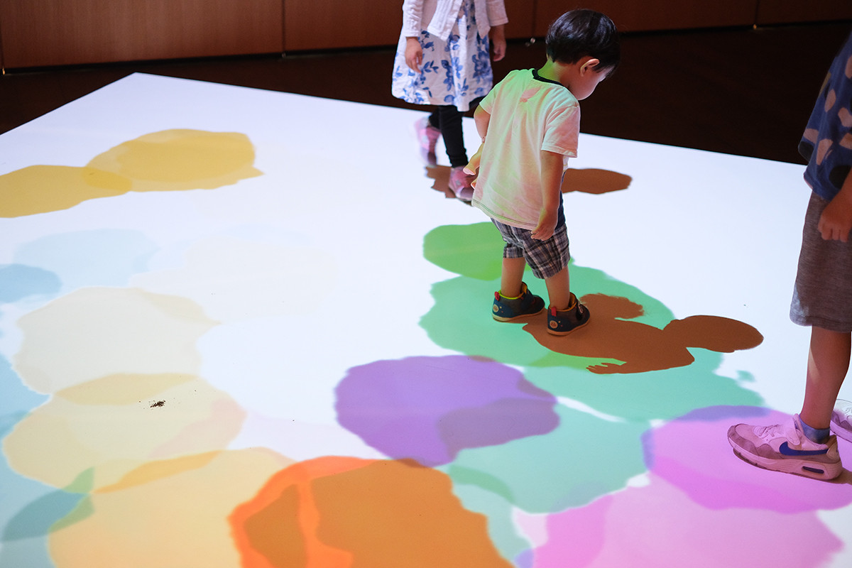 2018年に「いわさきちひろ生誕100年『Life展』あそぶ」でplaplaxが制作した《絵の具の足あと》も再展示されています。これはちひろの水彩技法のひとつでもある絵の具のにじみに着目した作品で、歩いた軌跡に絵の具のにじみが現れます。3人で作品の上をくるくる回っては、いろいろな色と形をつくって楽しんでいました。