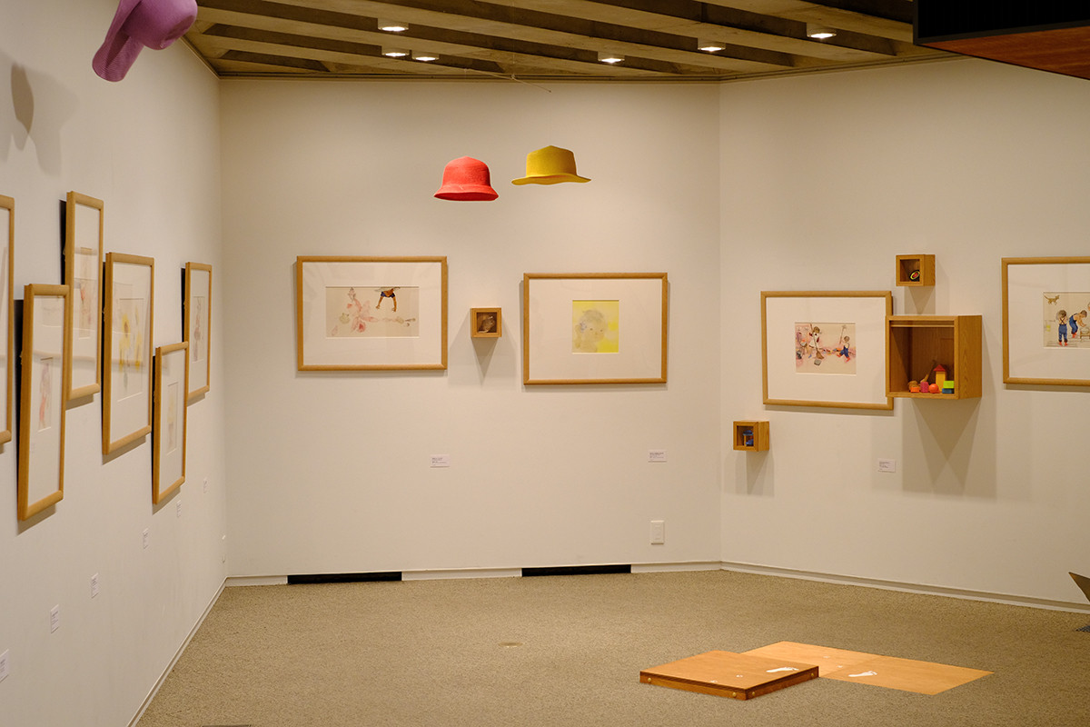 展示室に入るとまず目に飛び込んでくるのは、作品から飛び出してきたような帽子やてるてる坊主などのインスタレーション。まるでいわさきちひろの世界に入り込んだかのようです。なかには実際に手に取れるモノもあり、絵の世界と私たちの世界が重なるような楽しい仕掛けが随所に見られました。