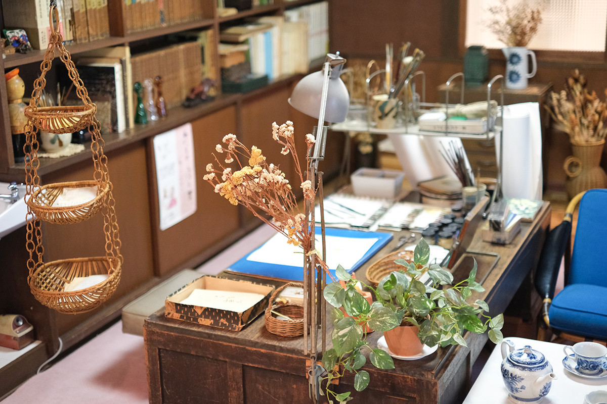 そのほかの見どころとして、常設されている「ちひろのアトリエ」があります。テーブルにはティーカップが出ていたり、部屋の奥にはピアノがあったり、ちひろの創作の合間の時間も想像できる空間です。子どもたちも芸術家のアトリエに興味津々。いろんな発見をして楽しそうでした。