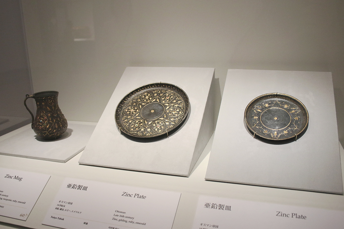 (左から)《亜鉛製取っ手付きポット》オスマン帝国 16世紀末 / 《亜鉛製皿》オスマン帝国 16世紀末 / 《亜鉛製皿》オスマン帝国 16世紀