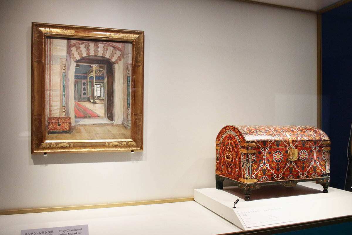 (左から)《スルタン・ムラト3世の間(ハス・オダ)図》イギリス 1926-33年 / 《エディルネ木画の葛籠》オスマン帝国 18世紀末