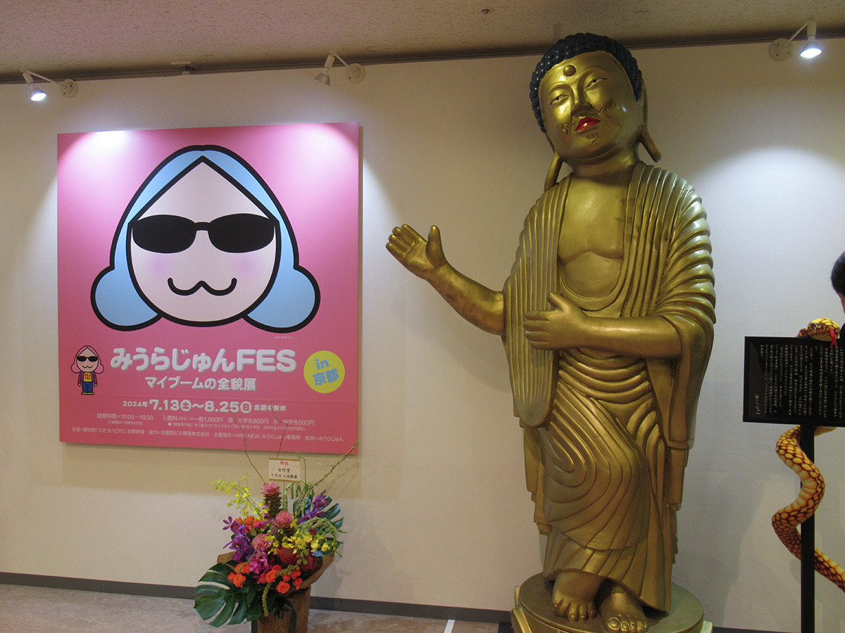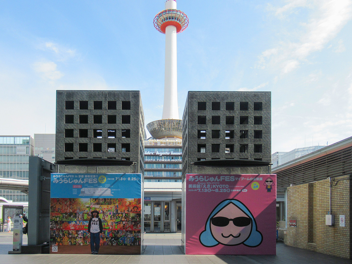 漫画家デビュー後、多方面で活躍される、みうらじゅんさんによる「みうらじゅんFES マイブームの全貌展 in京都」がスタートしました。「マイブーム」「ゆるキャラ」などの言葉を生み出し、みうらさんの自らのブームの変遷をたどり、収集したグッズたちと共にその熱い活動を振り返るFESです。主となる会場はジェイアール京都伊勢丹7階隣接の美術館「えき」KYOTOですが、駅ビルの広場などにもフォトスポットが展開されています。飲食店とのコラボや空中経路でのポスター作品展示、大階段の夜のイルミネーションなどもあり、何だかワクワクします。