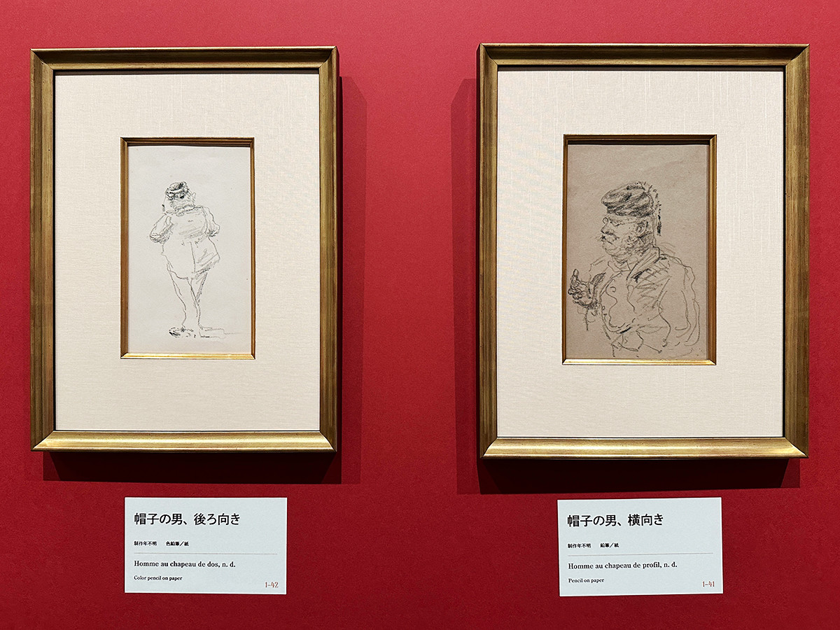 (左から)《帽子の男、後ろ向き》制作年不明 / 《帽子の男、横向き》制作年不明 ともに鉛筆 紙 展示風景