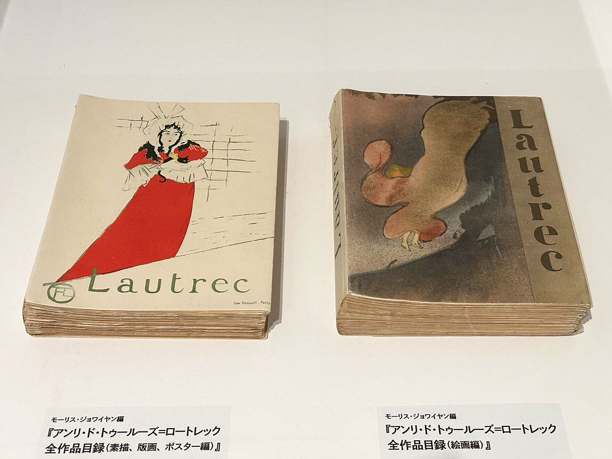 (左から)モーリス・ジョワイヤン編『アンリ・ド・トゥールーズ=ロートレック全作品目録(素描、版画、ポスター編)』1927年 / モーリス・ジョワイヤン編『アンリ・ド・トゥールーズ=ロートレック全作品目録(絵画編)』1926年 展示風景