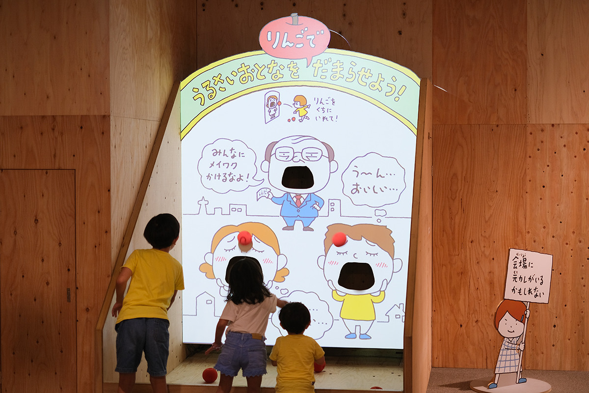 体験型の展示はまだまだあります。そして一番子どもたちのテンションがあがったのが「りんごでうるさいおとなをだまらせよう!」です。うるさいことを言う大人の口めがけてりんごを投げつけます。見事口に入るとおいしさでだまってしまいます。現実の大人も意外とそういうものかもしれません。