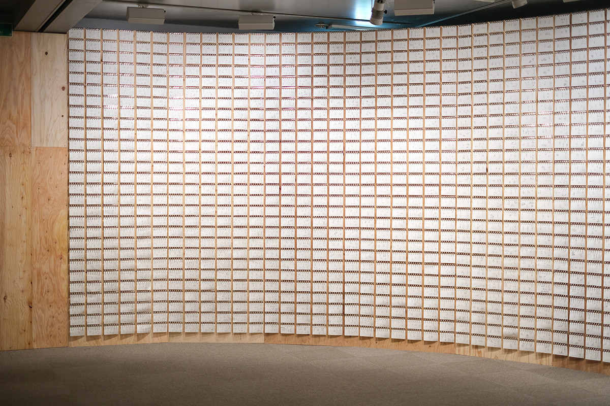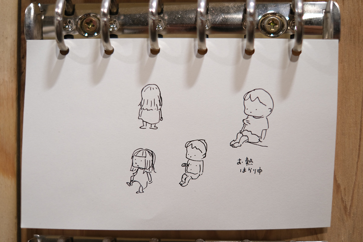 もちろんヨシタケさんの描いた作品もたくさん展示されています。圧巻なのは壁一面に約2500枚並べられた複製スケッチです。これは愛用の手帳に日々描きためたものだそうで、それぞれそのとき思いついたアイデアがペンで描かれています。