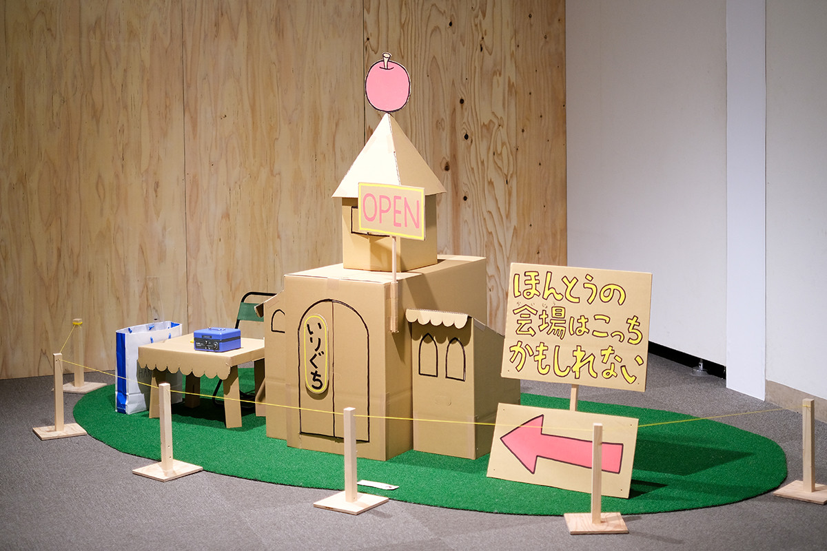 まず出迎えてくれたのは「ほんとうの会場はこっちかもしれない」という看板が立つ段ボールハウス。こちら実は展覧会のメインビジュアルにも登場しているものです。冒頭からヨシタケワールド全開で、この先どんな仕掛けが待っているのか期待に胸がはずみます。