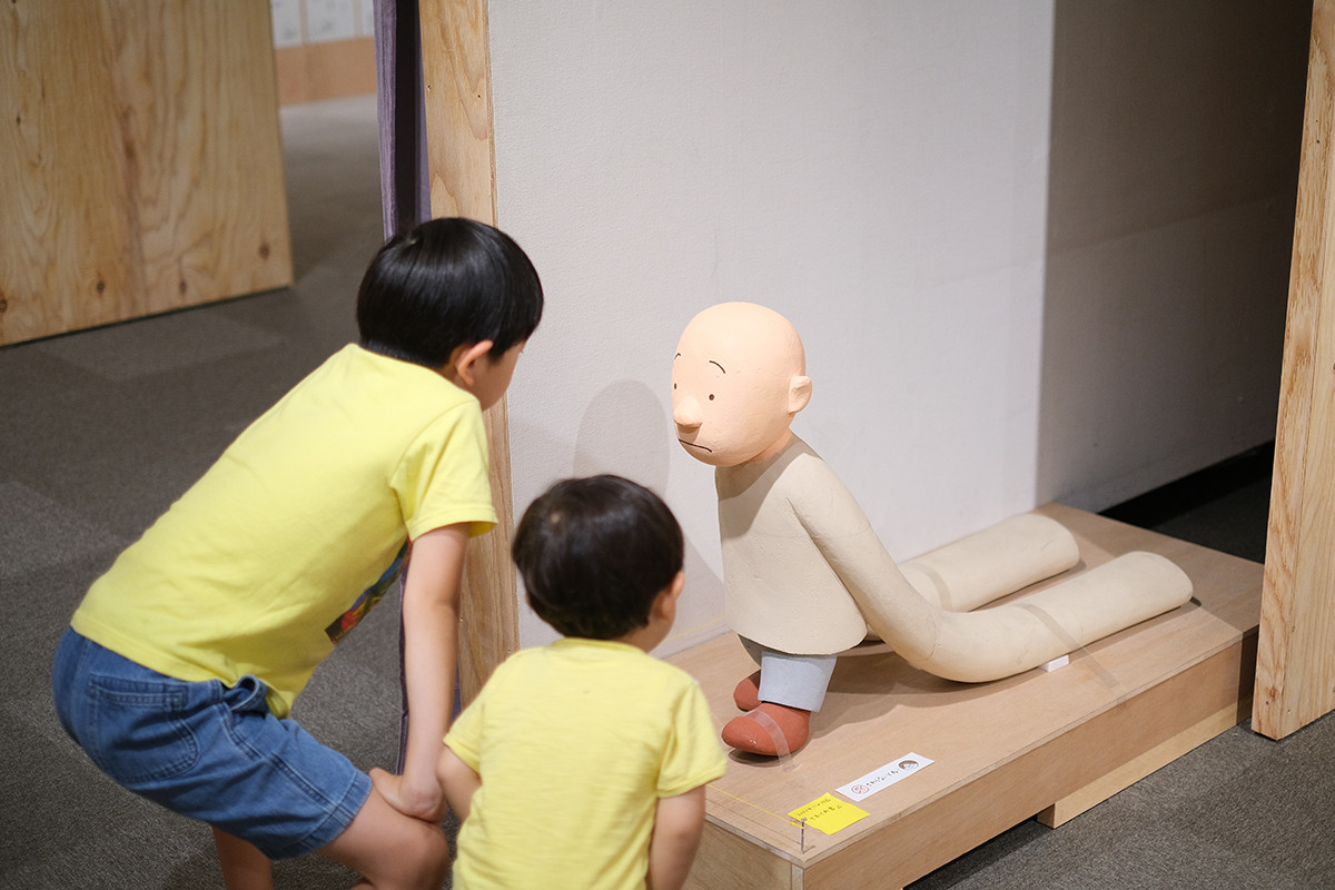 ちなみにヨシタケさんは絵本を出版する前からイラストレーターや造形作家として活躍されていて、今回はその当時の作品の一部も展示されています。やはりどれもユーモアたっぷりの作品で、特に《ておくれ君》は2歳の次男が大爆笑して何度もにらめっこしていました。