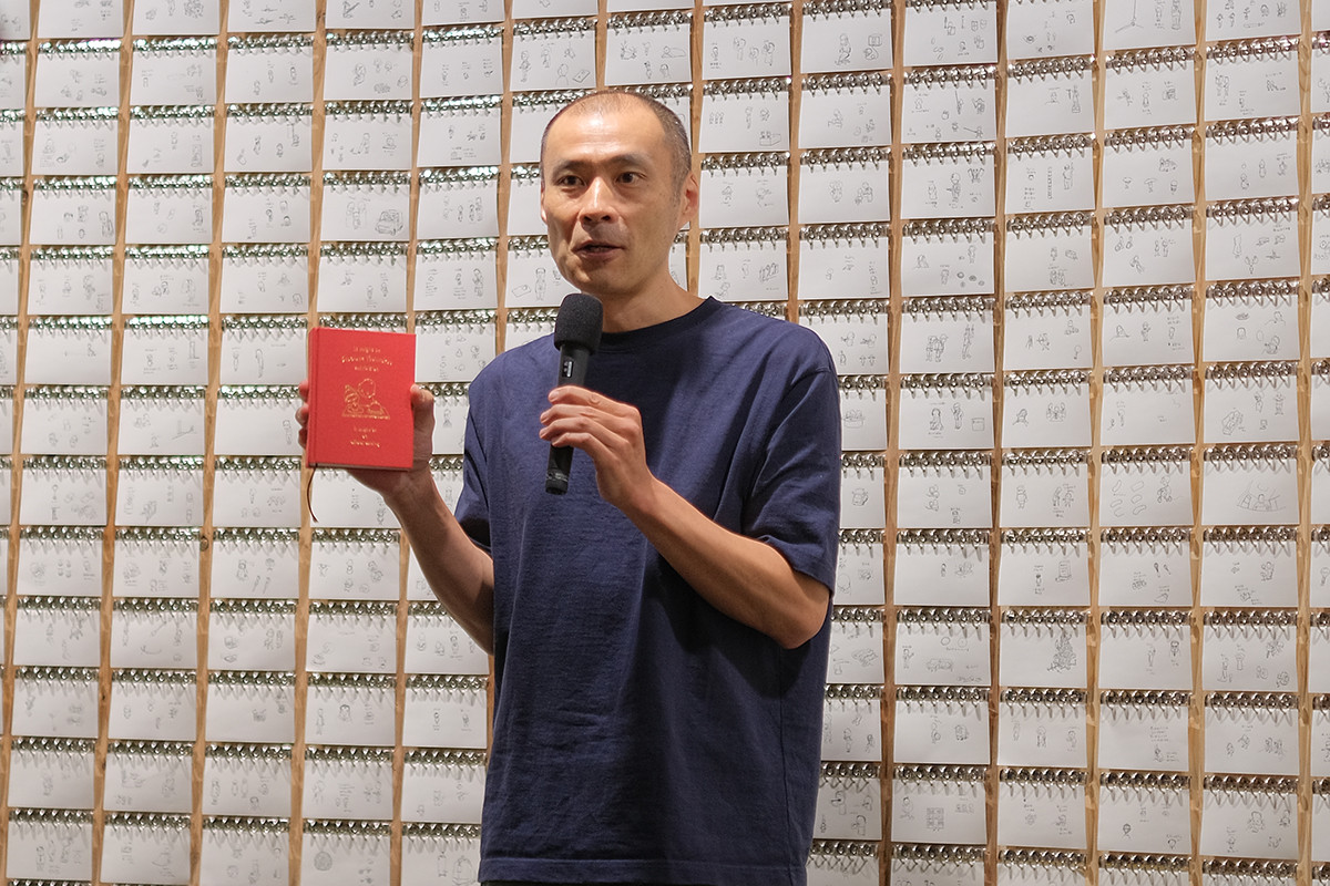 この日は、ヨシタケシンスケさんのギャラリートークもあり、展覧会に対する思いなどを語られました。ヨシタケさん曰く、自分が子どものころ展覧会というと「つならない」「早く帰りたい」と思っていたこともあり、今回はとにかく子どもたちが楽しめるものにしたかったそうです。