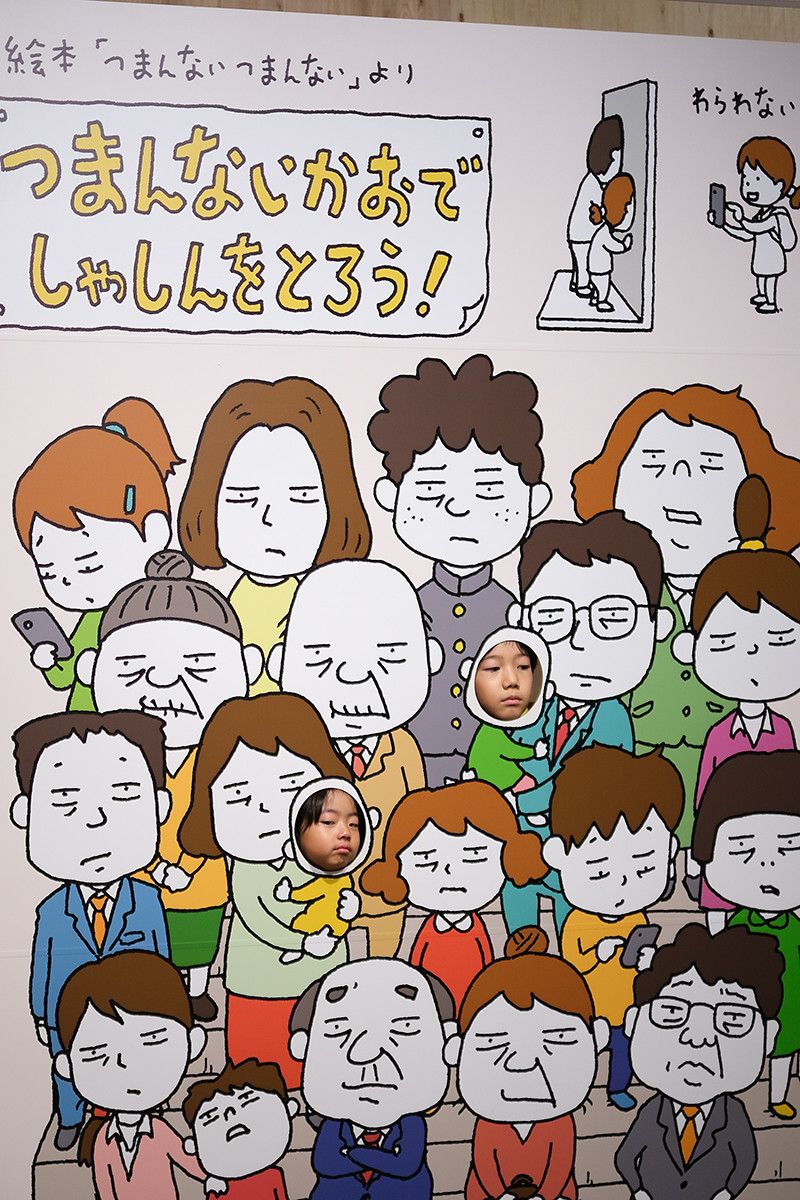 まずは絵本『つまんないつまんない』がモチーフの、つまんない顔で写真をとるパネルです。普通、顔はめパネルは笑顔になるものですが、ここではできるだけつまらない顔をしないといけません。二人ともいい感じでつまらなそうです。