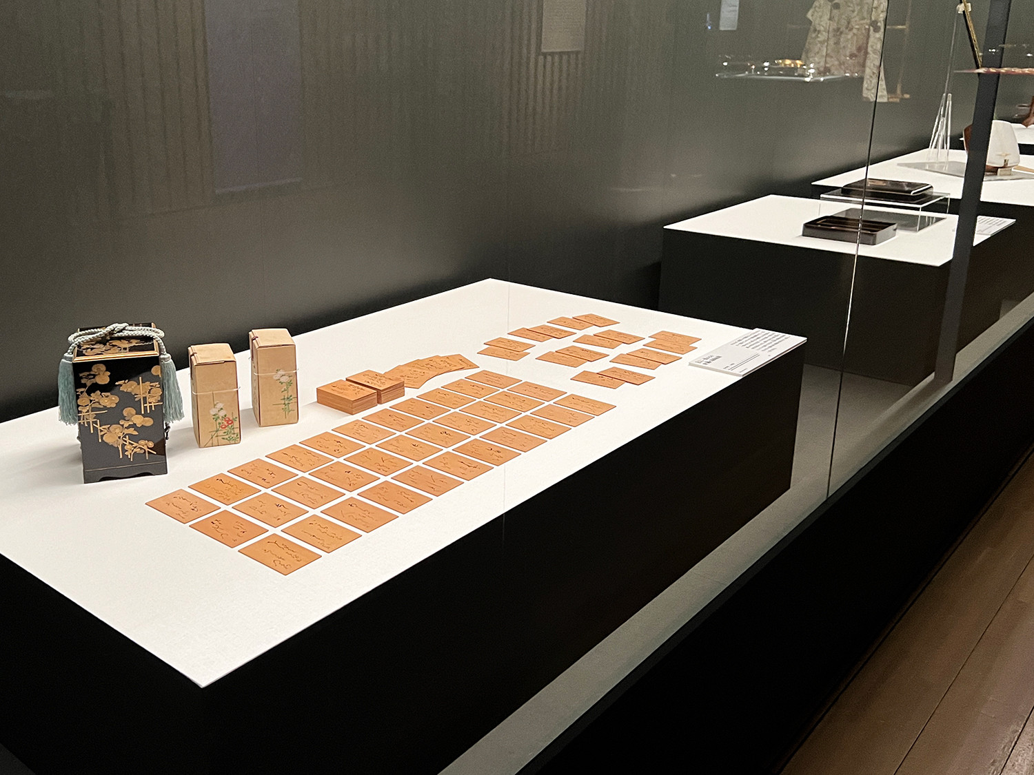 千代姫の婚礼調度は、「初音の調度」の名で親しまれています。「源氏物語」第二十三帖の「初音」に題材をとった「初音蒔絵調度」や、同じく第二十四帖「胡蝶」に基づく「胡蝶蒔絵調度」、その他の蒔絵調度や染織品、刀剣など合わせて70件は、平成8(1996)年に一括して国宝に指定されました。会場では、国宝「初音の調度」の中から初音蒔絵旅眉作箱が展示されています(展示替あり。7/31からは胡蝶蒔絵将棋盤・駒箱を展示)。