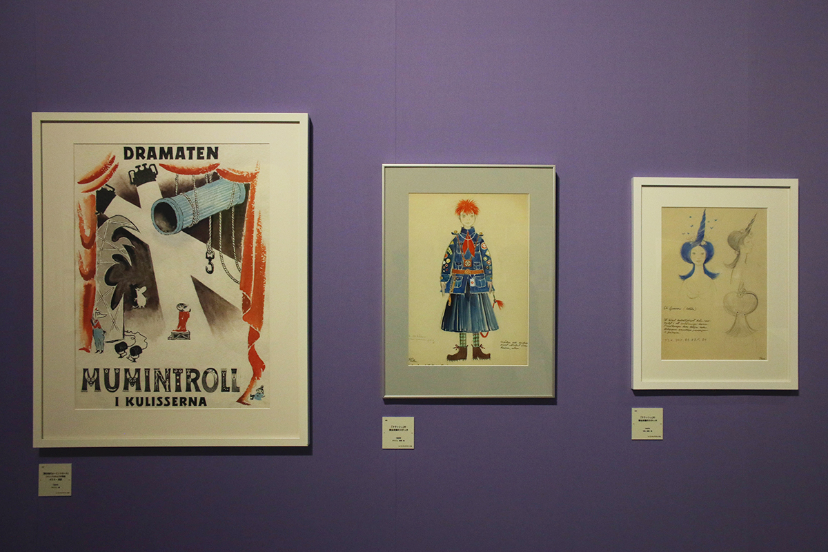 (左から)《「舞台袖のムーミントロール」(ストックホルムでの再演)ポスター原画》1982年 / 《「クラッシュ」の舞台衣装スケッチ》1963年 / 《「クラッシュ」の舞台衣装スケッチ》1963年 いずれも、ムーミンキャラクターズ社