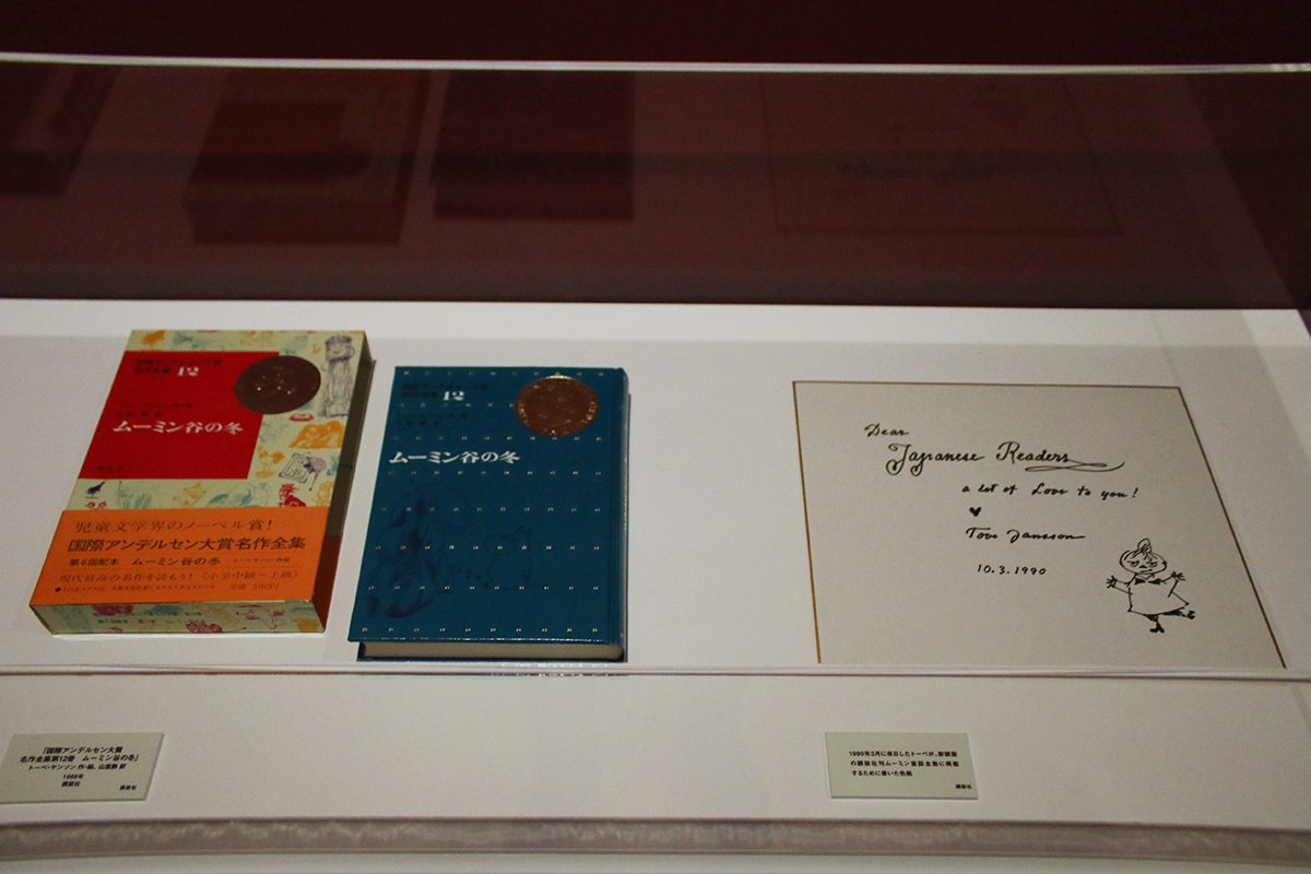 (左)《国際アンデルセン大賞名作全種第12巻 ムーミン谷の冬》トーベ・ヤンソン 作・絵、山室静 訳 1968年 講談社 / (右)《色紙》1990年 3月 いずれも、講談社所蔵
