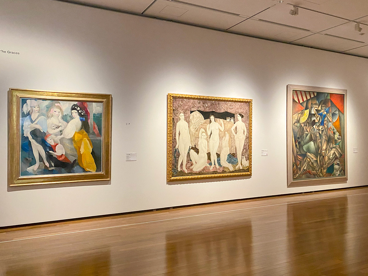 (左から)マリー・ローランサン 《プリンセス達》1928年 NAKKA、藤田嗣治(レオナール・フジタ)《五人の裸婦》1923年 MOMAT、ジャン・メッツァンジェ 《青い鳥》1912-13年 MAM(トリオ《美の女神たち》)