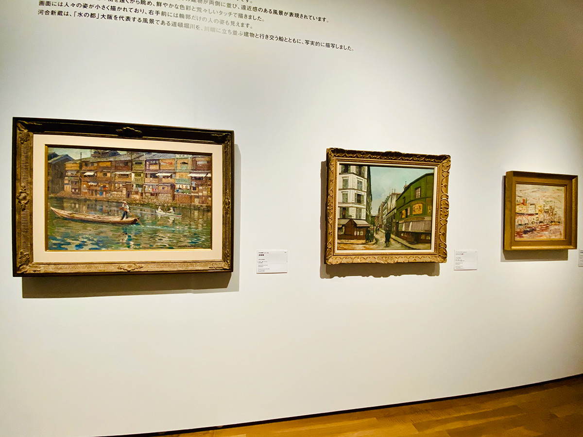 (左から)河合新蔵 《道頓堀》1914年 NAKKA、モーリス・ユトリロ 《セヴェスト通り》1923年 MAM、長谷川利行 《新宿風景》1937年 MOMAT(トリオ《都市と人々》)