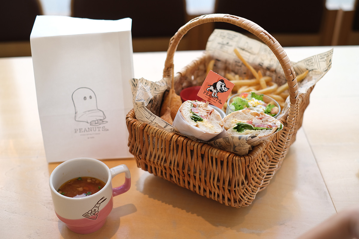 ハロウィーン仕様はミュージアムだけではありません。隣接するピーナッツカフェでは、企画展に連動したハロウィーン限定メニューが3種類販売されています。中でも『HOLIDAY!ピクニックボックススープ付き』はケイジャンチキン・ベーコン・トマト・タマゴなど具沢山のアメリカンクラブサンドやフライドポテト&コーンドック、スープなどが楽しめるピクニックボックスでボリューム満点。彩り鮮やかで味も絶品でした。ポテトはおばけの袋に入れてシャカシャカするものでテンションがあがること間違いなしです。