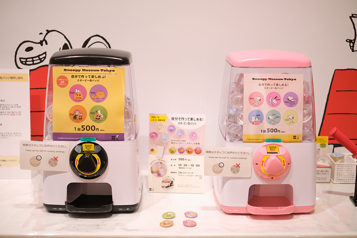 また、これまで期間限定で開催していた「スヌーピー缶バッジ」のワークショップが、9月以降は平日開催でレギュラー化されることになり、既存のデザインのほか、期間限定のハロウィーンデザインが4種類加わっていました。作業としてはアルファベットや数字、ハートなどのかわいいシールを自由に貼っていく簡単なものなので小さなお子様でも作ることができます。所要時間5分~10分で自分の名前や記念日などを入れた缶バッチが完成しました。