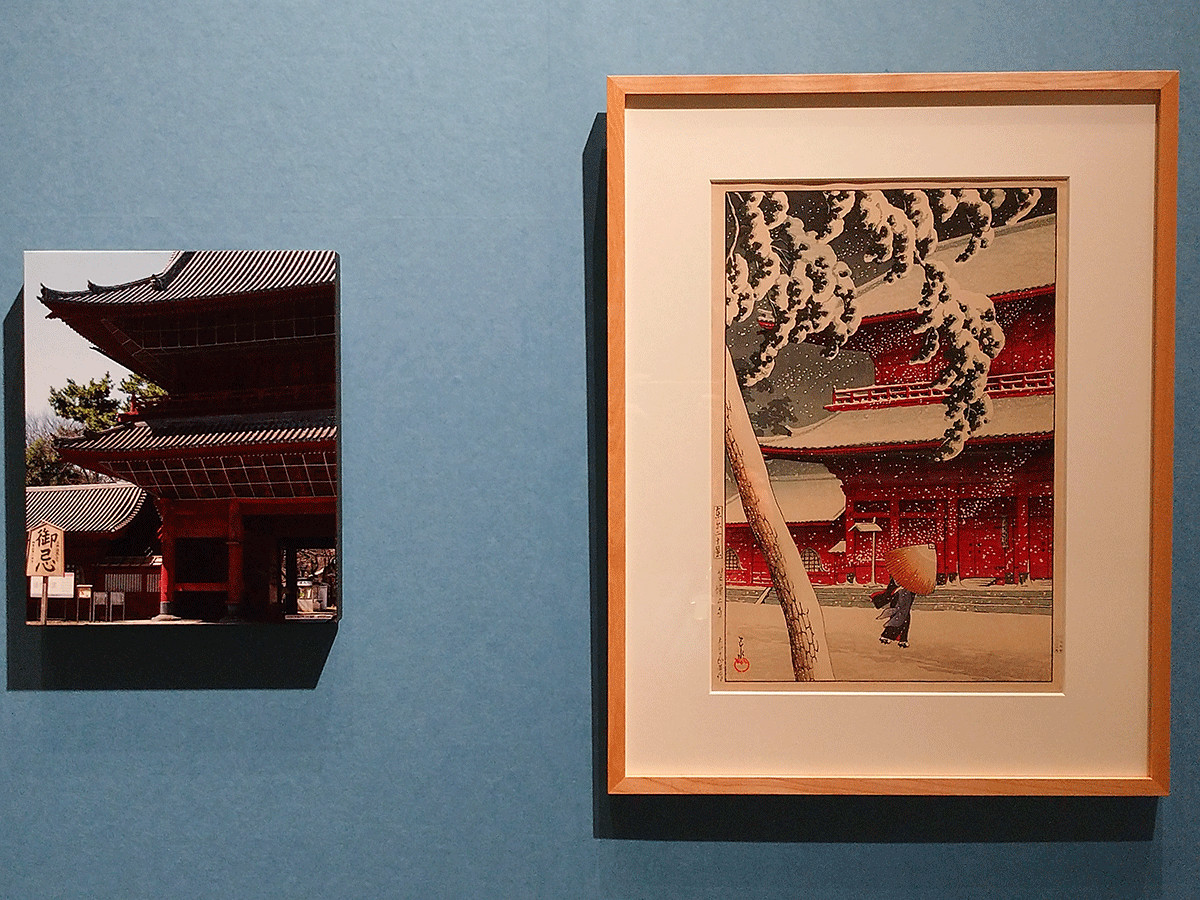 人生最長の旅に出発し、マンネリ化が見えた画風もスランプを乗り越えることに成功。震災から復興してゆく東京の姿を題材にするなど代表的シリーズが確立します。『東京二十景』、『東海道風景選集』など新たな魅力を持った作品は住友や三菱といった財閥の支えもあり、益々巴水の名声を高めることとなりました。描かれた場所の現在の様子も並んでいるパネルで比べることができます。