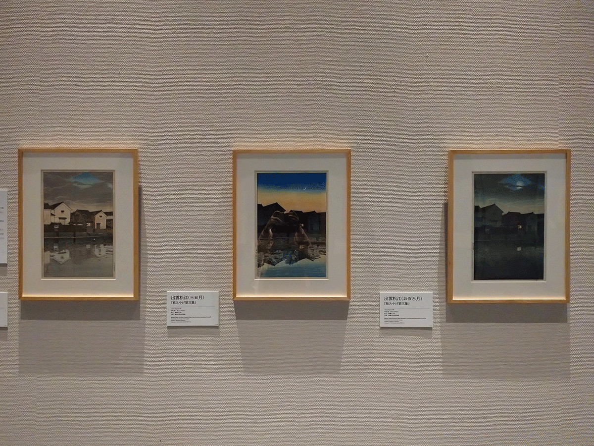 《出雲松江 左(曇り日)中(三日月)右(おぼろ月)》 旅みやげ第三集 1924年 版元・渡邊木版美術画舗蔵 同じ景観を時間や天候による印象の変化を見せた