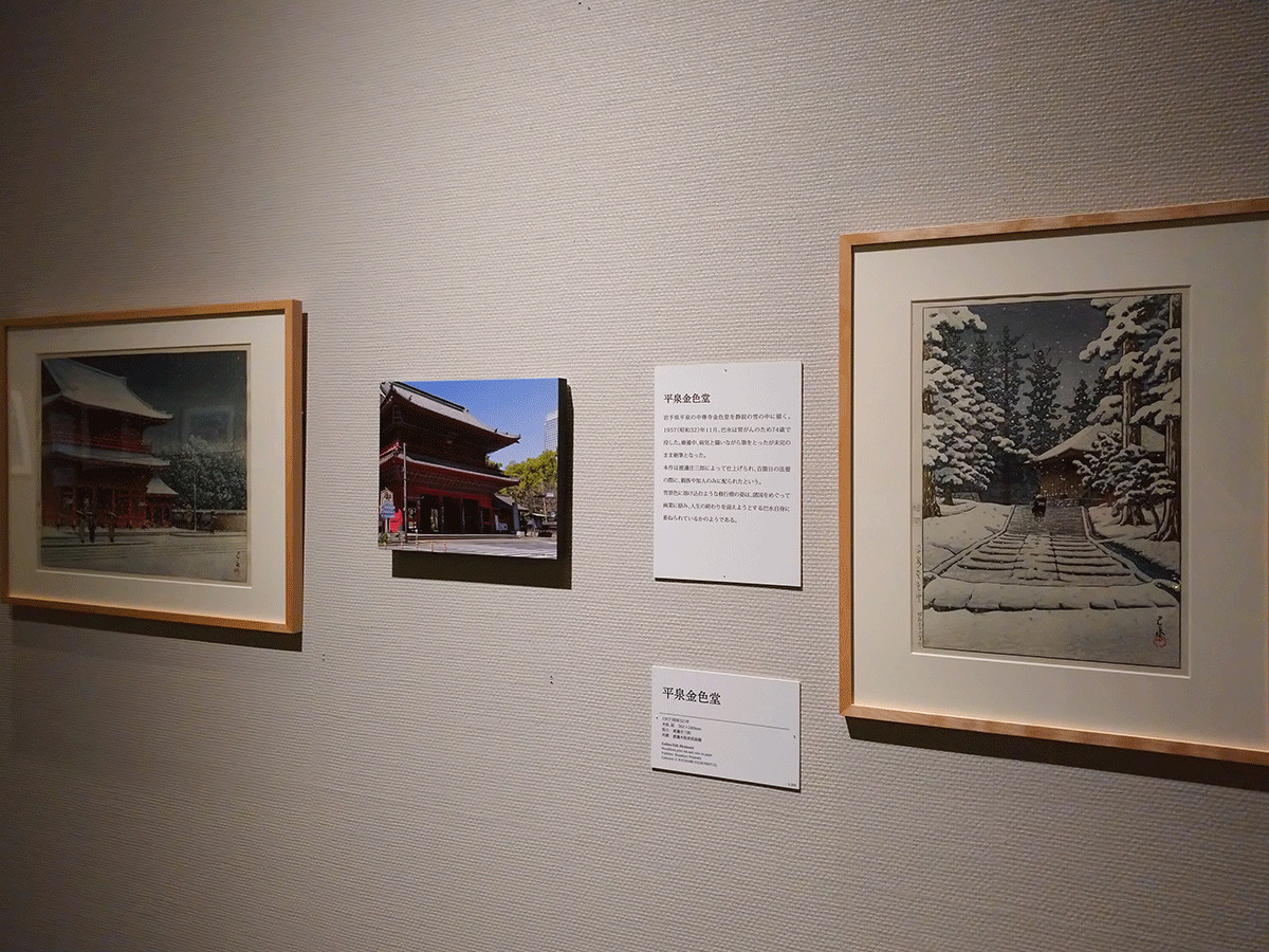 『平泉金色堂』は未完のまま絶筆となったものでしたが、版元渡邊庄三郎が仕上げ、巴水の百箇日法要で配られたというエピソードを持つ大切な1枚です。多くの熟練者との出会いはチームとして巴水の新版画に名声をもたらし、今も多くの人の思い出と重なる作品となって心を打ちます。