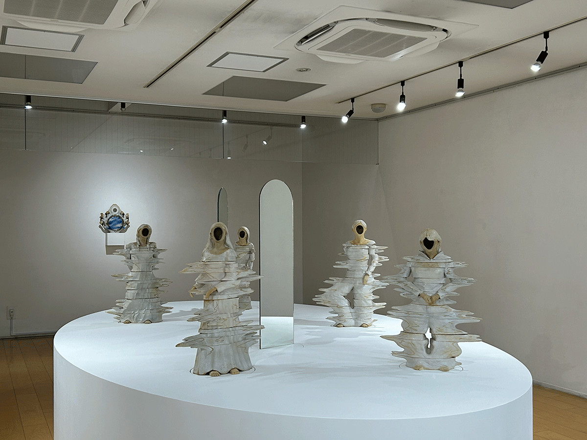 後藤あこの《細い目》は、舞台の上に置かれた5体の陶の人形と2枚の鏡、舞台の奥の壁と手前の壁に1点ずつ掛けられたレリーフで構成されています。人形と鏡は、あるものは時計回り、あるものは反時計回りに回転します。不思議なことに人形の顔は、大きな空洞になっており、表情は読み取れません。