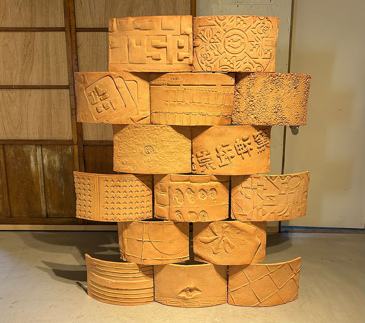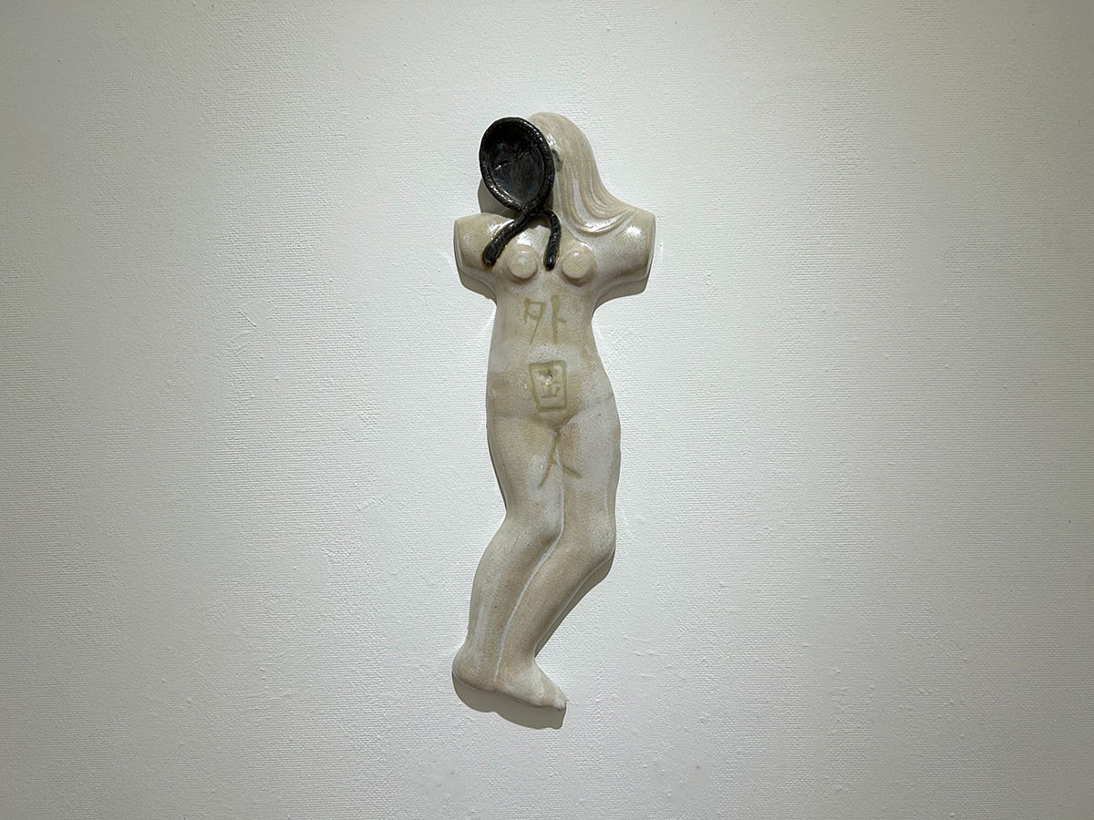 下の写真の人型のレリーフは、顔の部分が隠され、腹部には「外国人」と書かれています。作品タイトルの《細い目》(Small eyes)の俗語としての意味を含め、後藤が日常生活で感じる葛藤や疎外感を表現しているように思います。