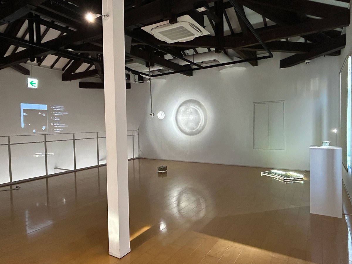 展示室の入口から左手奥の壁面の映像(6分30秒)を見ると、制作の過程が簡潔にまとめられています。 瀬戸は焼き物の産地として有名ですが、ガラスの原料となる良質な珪砂も産出していました。制作のテーマを「鏡」とする井村は、魔鏡の制作過程を見せることで、観客に瀬戸の産業の歴史を思い起こさせます。