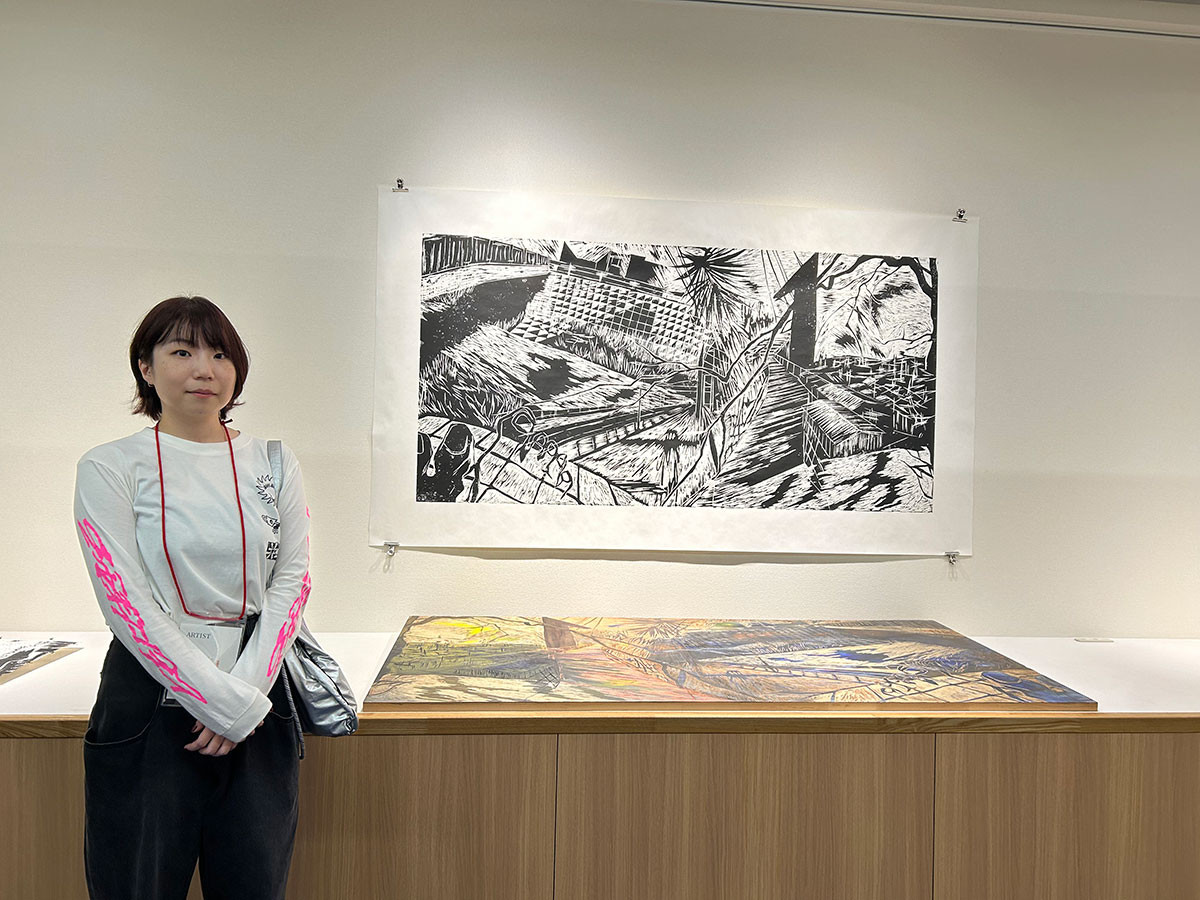 田口薫の《光の跡、遡行する影》は、瀬戸の風景を題材にした、とても大きな版画の組作品です。一般的な版画展では、摺り上げた版画のみを展示しますが、田口は彩色した版木も一緒に展示する点が特徴的です。