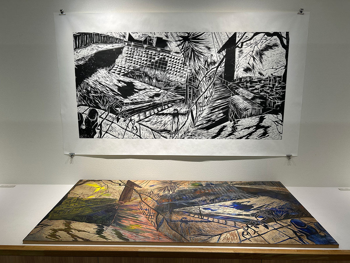 上下に展示された版画と版木を見比べると、版木には線や形があるのに、版画には写し取られていない部分があります。また、版木はアクリル絵の具で彩色されていますが、版画はモノクロの仕上がりです。
