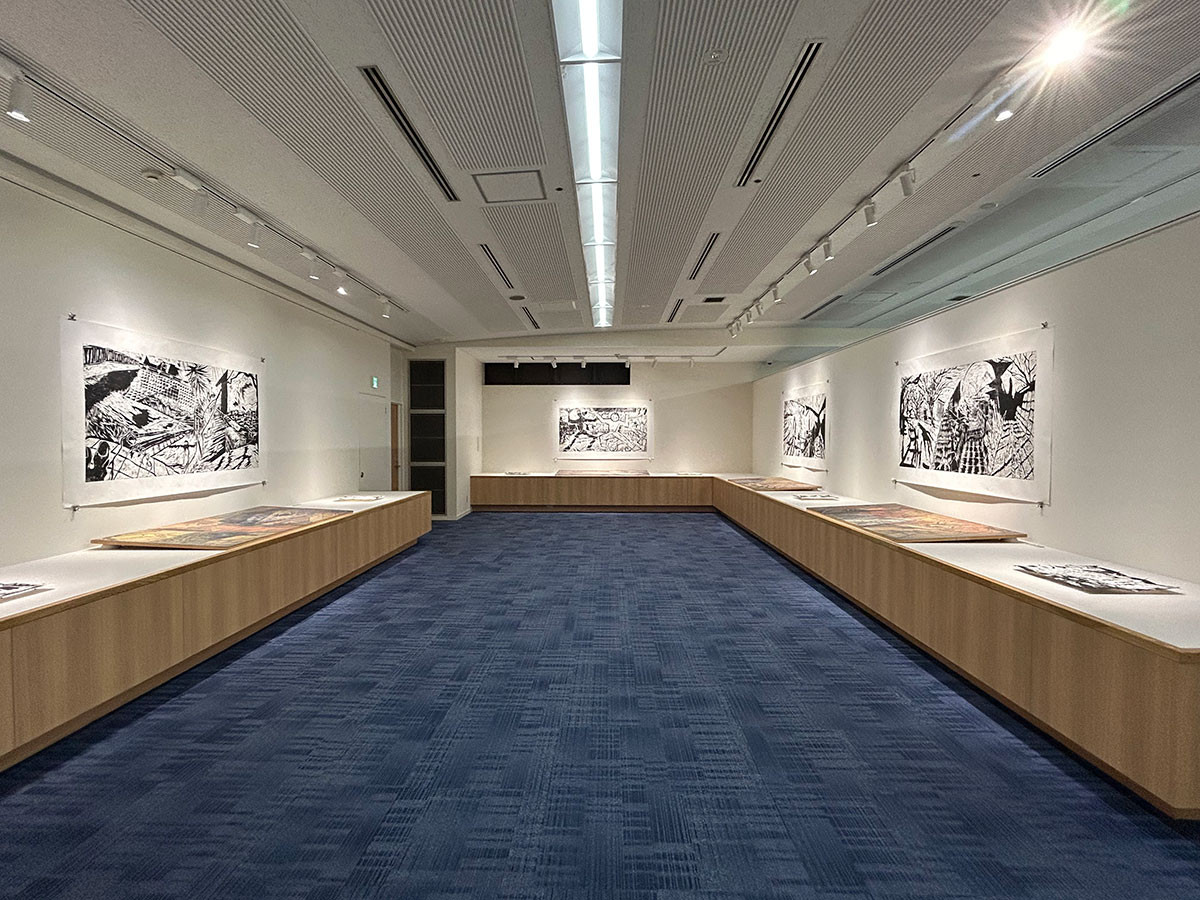田口の版画の摺り方は東南アジア風で、紙を下に広げ、インクをつけた版木を上に載せ、版木を足で踏むそうです。いわば、田口自身がプレス機として機能するわけです。その話を聞くと、展示された大きな作品を何枚も摺るのは、なかなか大変そうです。