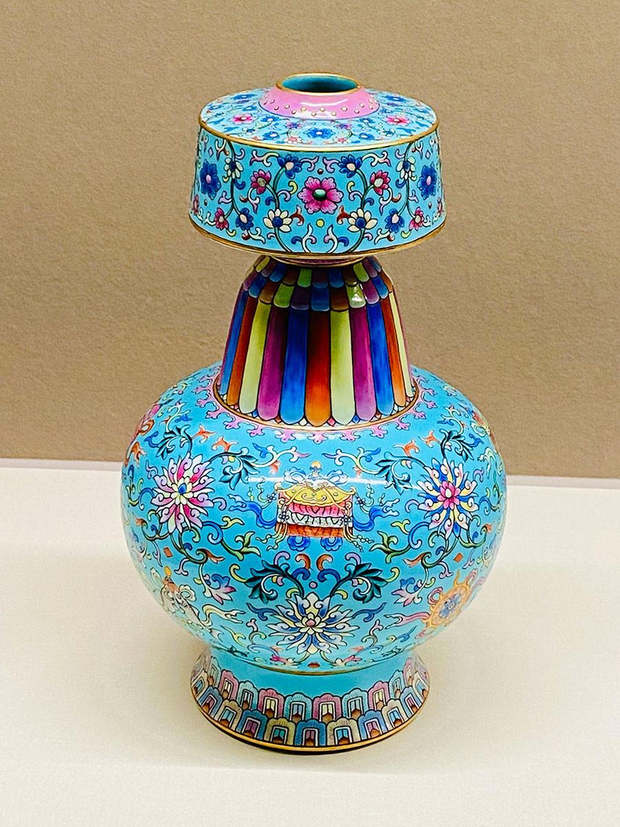 目の前がパッと華やぐマルチカラーの独特な形の瓶は、清朝の宮廷で崇拝されたチベット仏教の儀礼用とされています。蓮の花、金魚、宝傘などの八宝が描き込まれ、やきものの黄金期:清朝磁器の芸術の高さが分かります。