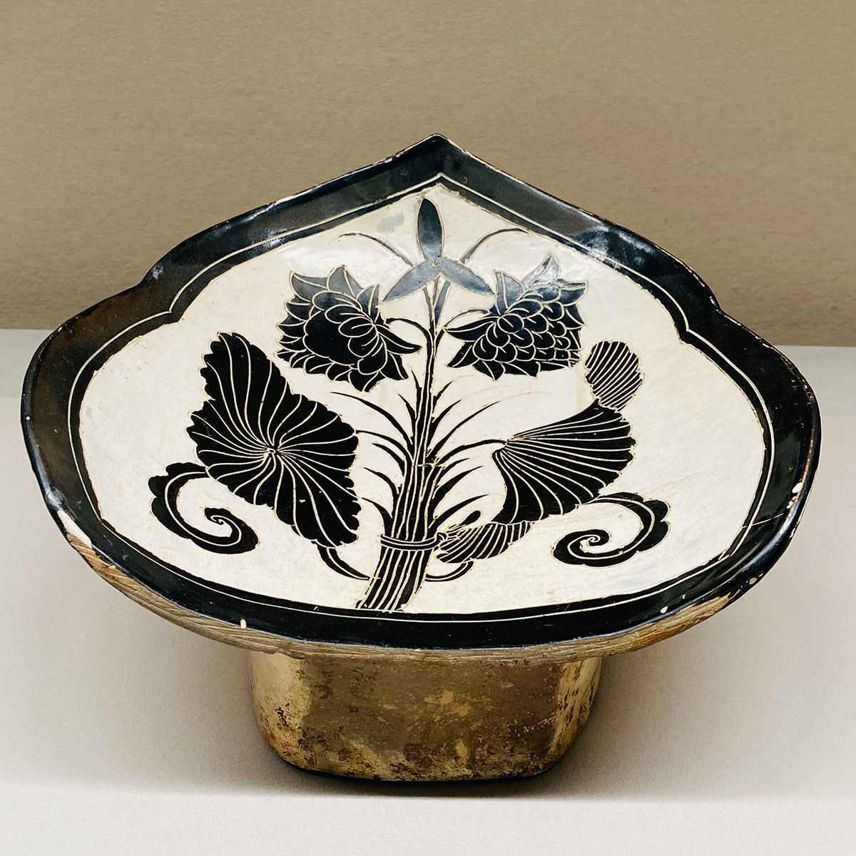 陶磁器製の枕は唐代に誕生し、宋代には磁州窯を中心に展開しました。如意形と束蓮文には吉祥の願いが込められているので幸せな夢をということでしょうが、それにしても硬そうな枕、熟睡できたのかな・・・。