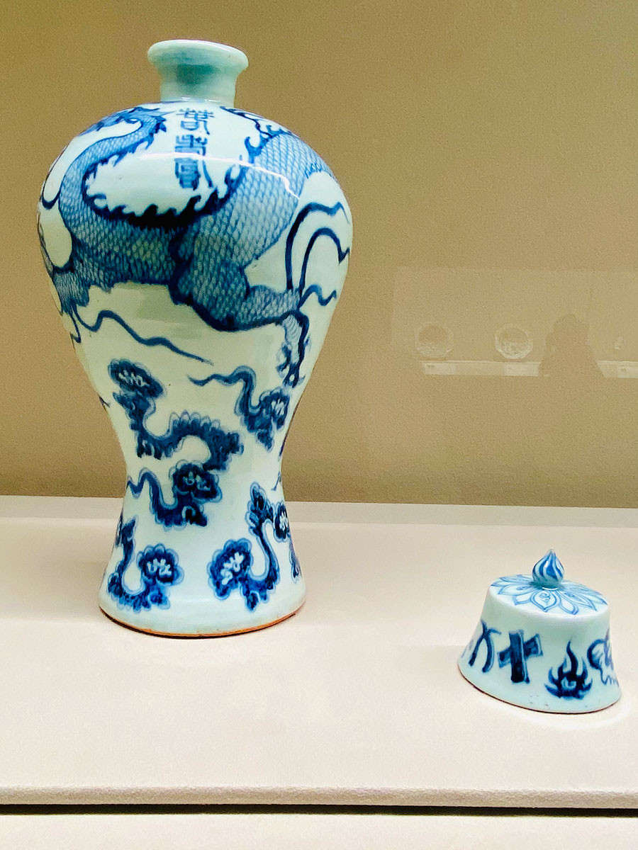 洪武年間の宮廷用器と考えられています。「春壽」銘のある青花雲龍文梅瓶は、世界に僅か4件しかなく、そのうちMOCO所蔵品には唯一蓋が伴っています。上海博物館からお越しの陶瓷研究部副主任は、「蓋があっていいですね…」と呟いておられました。 日本と上海に離れていた2作品が隣同士に並ぶ競艶も見どころです。