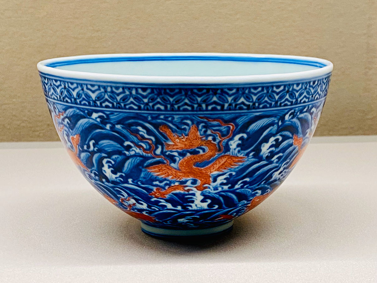 上海博物館には、これまで“空白期”と呼ばれていた明時代・15世紀の正統・景泰・天順の三代(1436~1464)の景徳鎮磁器の優品が多数所蔵されています。この“空白期”に現れた作品は、碗の外面に青花で描かれた波涛文内に、鮮やかな紅彩の九種類の海の瑞獣が描かれています。展示室でひときわ目を引く紅色に惹かれ、近づいてみるとそれは、ユニークな海獣デザイン。宮廷の宴席で使用されていたセットでしょうか。海外初公開。