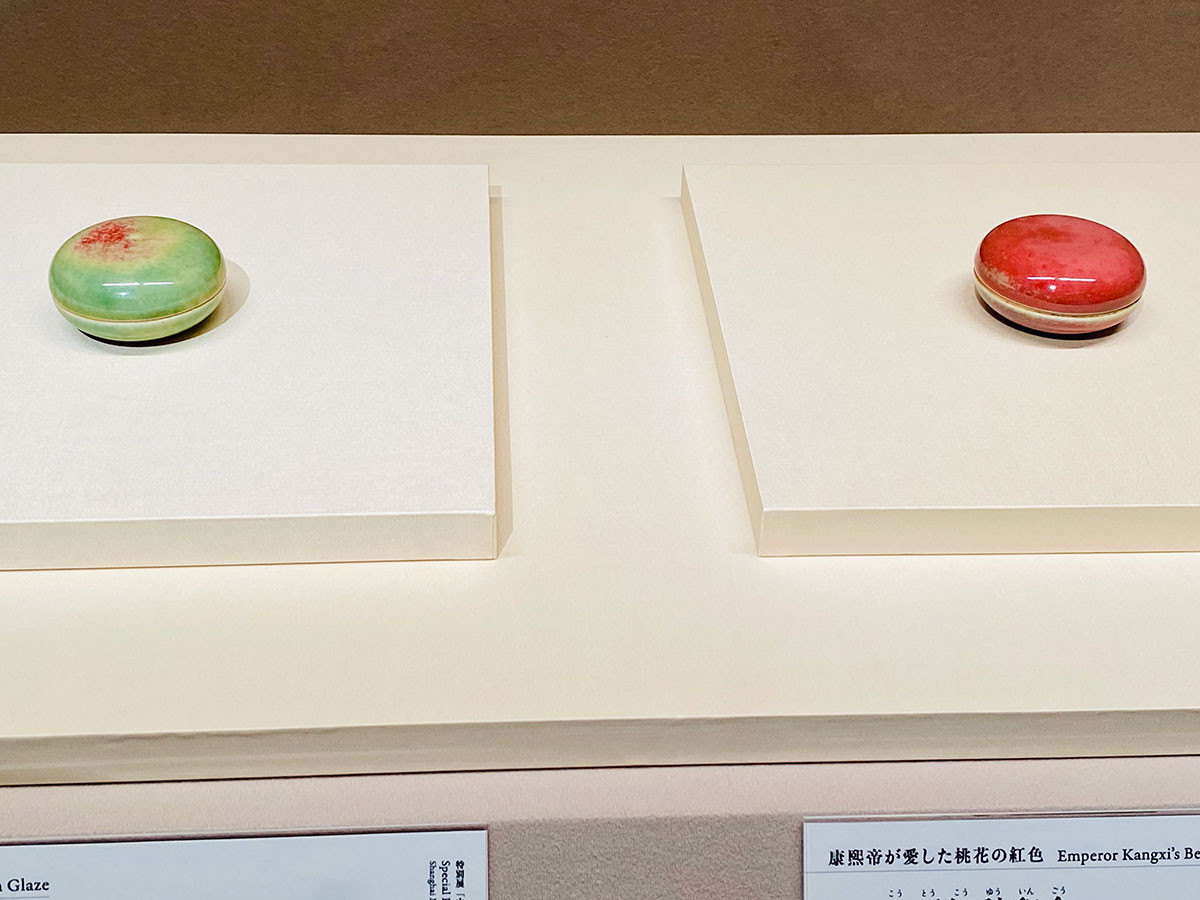 清朝宮廷御用磁器の希少なアップルグリーン色のこの作品は海外初出品、初めて日本で展示されます。鮮麗な紅色の「豇豆紅釉」は特に希少で製作が難しいとされていて、紅色を出そうとしたところが窯変(窯の中で焼成中に色の変化が生じること)によって、奇跡のアップルグリーンが誕生したものです。直径7cm程のマカロンのようなフォルムがとても可愛らしい作品です。