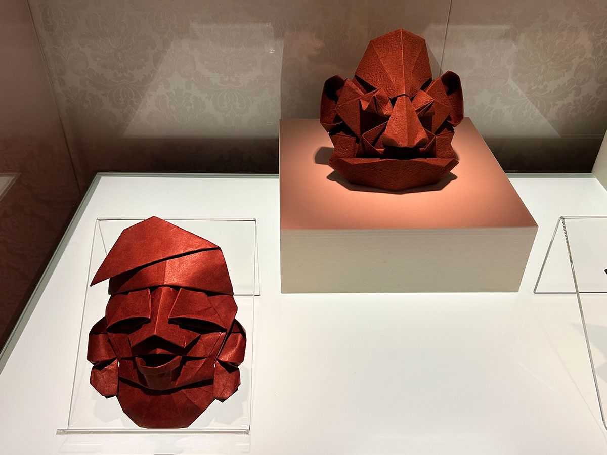 展示の冒頭に、面(マスク)が並んでいます。日本の仮面をお手本に、布施が20代半ばに作成したものです。面の制作は、当時、師事していた河合豊彰の影響で始められました。それにしても、折り紙で作成されたとは思えない、生き生きとした表情をしています。